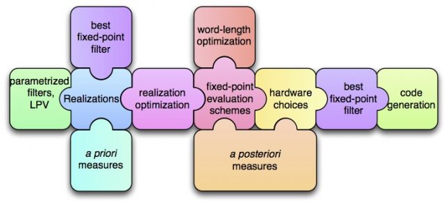 The main idea is to tackle this problem with a global point of view, combining all the different complementary approaches into a global flow, from mathematical object (such as filters) to code. From a Signal Processing point of view, it consists in modeling all the numerical errors as roundoff noises and uses dedicated tools to evaluate statistically how they propagate up to the output(s). From an Computer Architecture point of view (often linked with the signal processing one), it concerns the Fixed-Point arithmetic, the algorithm-architecture adequacy and, for Hardware cases (FPGAs and ASICs) the optimization of the involved bit-width (in a multiple word-length paradigm). The Control approach shows us how to use the equivalent realization set (a set of mathematically equivalent algorithms, that are no more equivalent in finite precision; it is often parametrized with a free transform matrix, like in the State-Space case), and consider some equivalent algorithms that may requires more operations but are much more well conditioned (or equivalently, that requires less bits to achieve the same final accuracy). And we also intensively used the Computer Arithmetic tools and methods for the error analysis in order to make them reliable (interval arithmetic, reliable computing, rigorous error analysis and multi-precision or arbitrary precision computing). These have been developed mainly for mathematical function implementation, and we try to transpose them to Signal Processing/Control algorithms (the feedback is here a problem key).